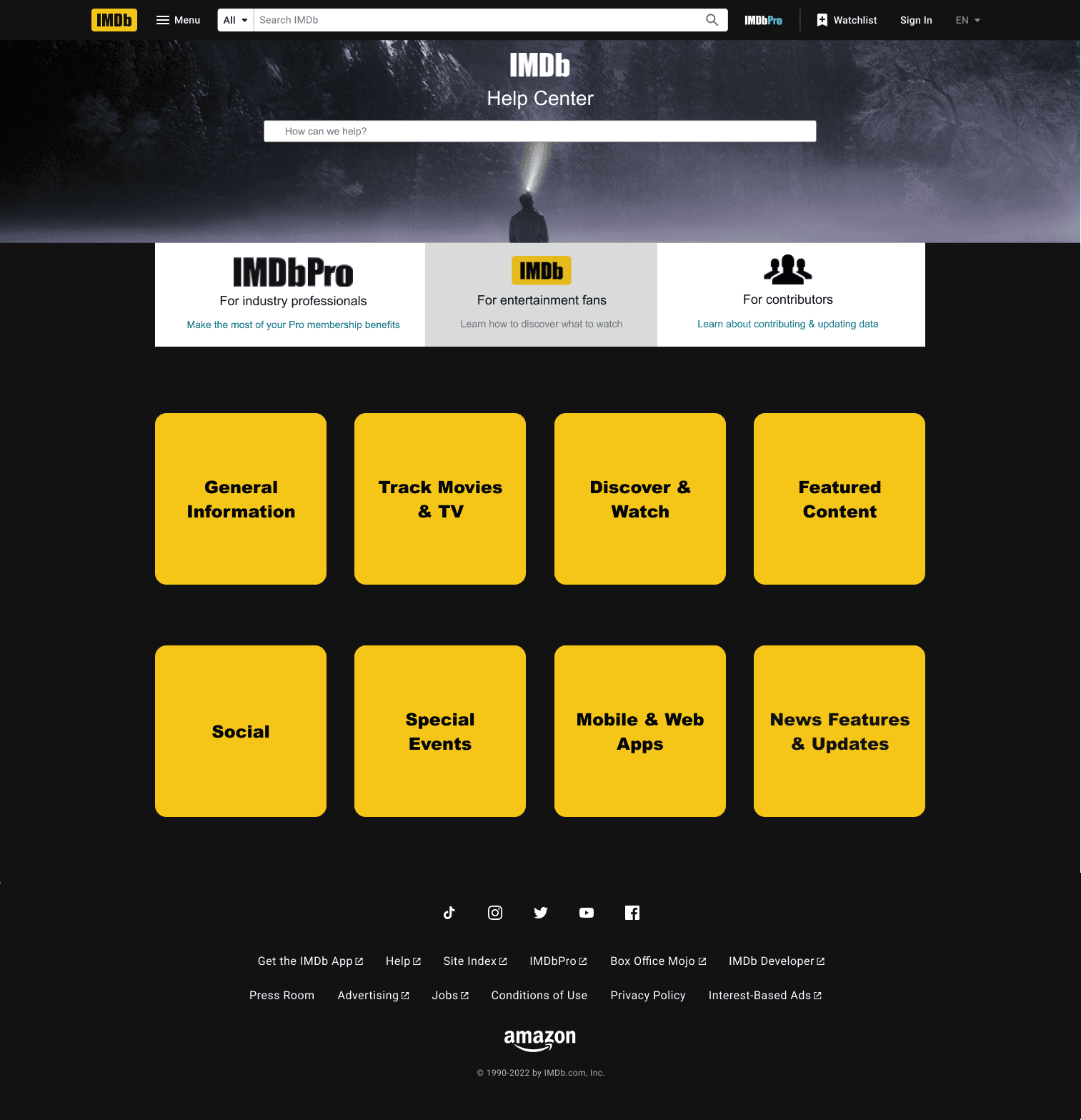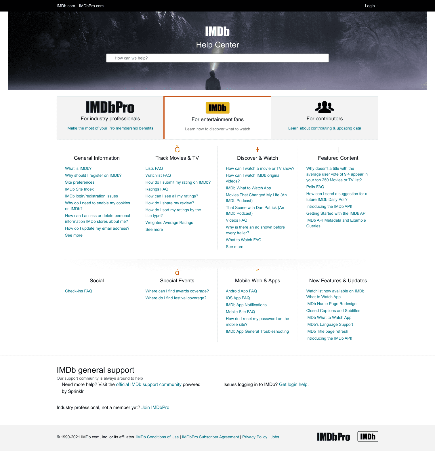 The original IMDb "Help Center" suffered from an overwhelming display of links that forced users to scan through dense, unorganized columns of text to find specific assistance. This lack of visual hierarchy and categorization made the page feel inaccessible and cluttered. By presenting every possible help topic at once, the interface created significant decision paralysis for users who were likely already frustrated and seeking quick solutions.