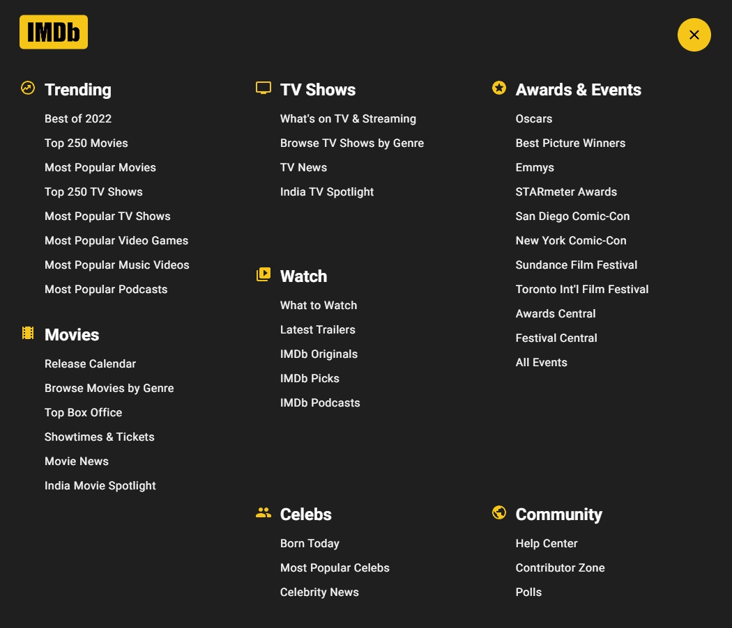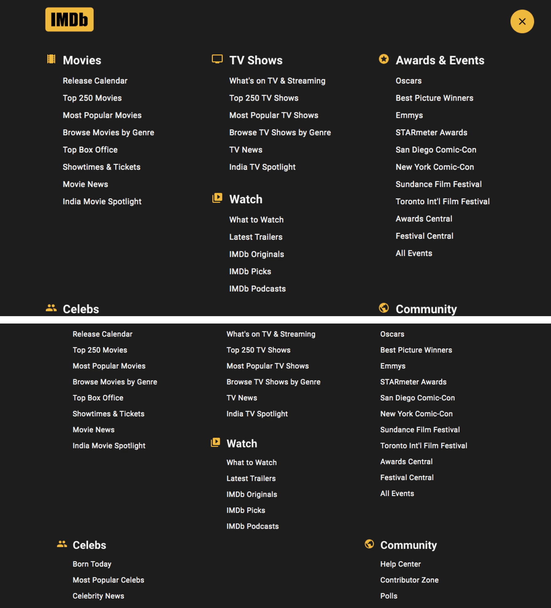 The original user interface of the IMDb navigation system involved a total overhaul of the Information Architecture (IA). By auditing the original "mega-menu" footer, I identified that the fragmented links were creating a high degree of interaction cost and cognitive friction.