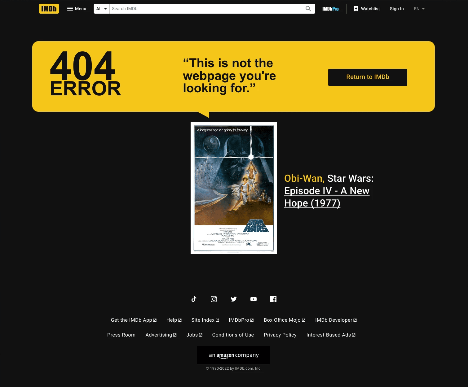The original IMDb "Error 404" page was a functional dead end. It lacked the site’s global navigation, effectively trapping the user on a broken page with no clear way to return to their previous task. Furthermore, the error message was vague and lacked the brand's personality, failing to provide constructive paths forward beyond a single home link.