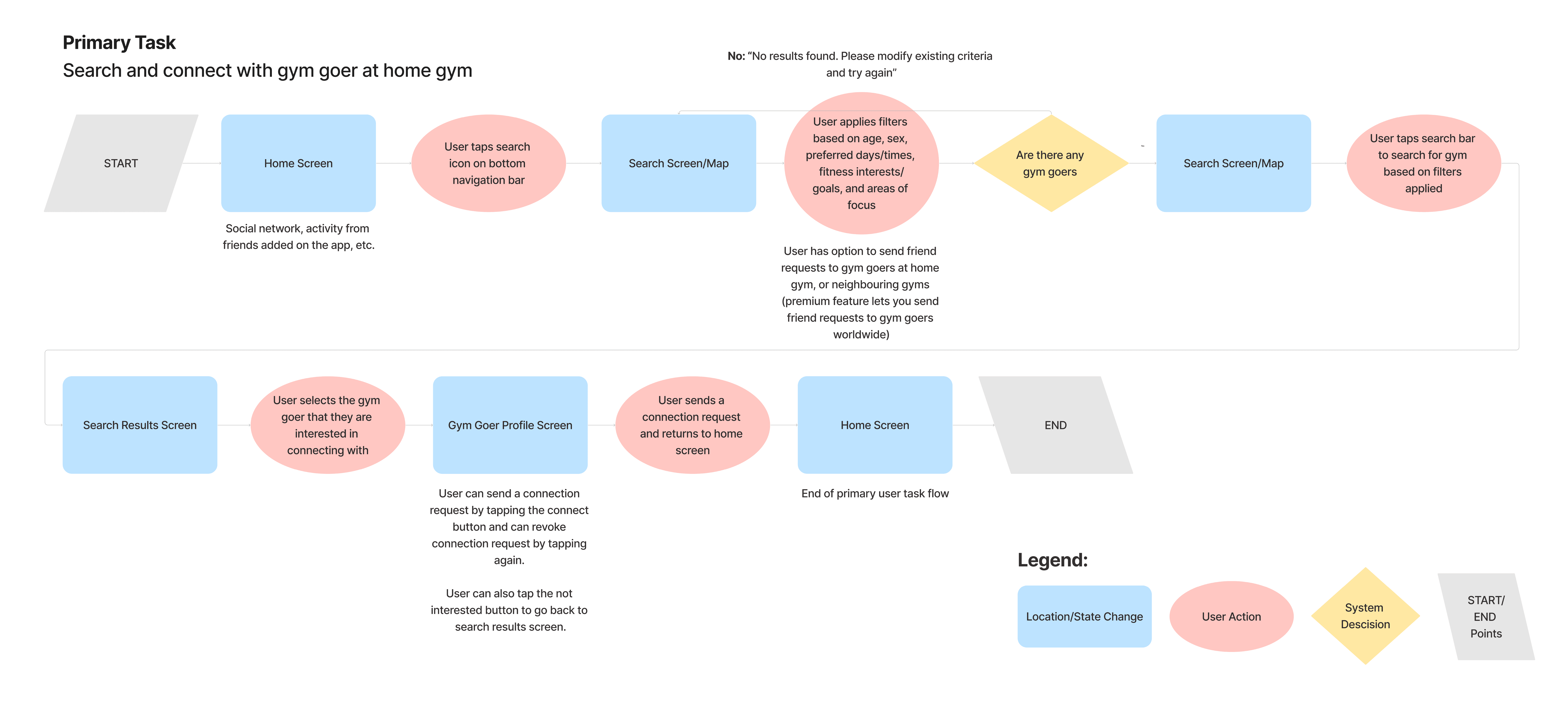 The primary flow focuses on the initial introduction to the world of social fitness. We streamlined the search and filter process to allow users like Andrea to find compatible gym partners based on specific criteria (location, fitness goals, and availability). By visualizing this path, we ensured that the transition from search to request sent is linear and reduces the cognitive load on the user.