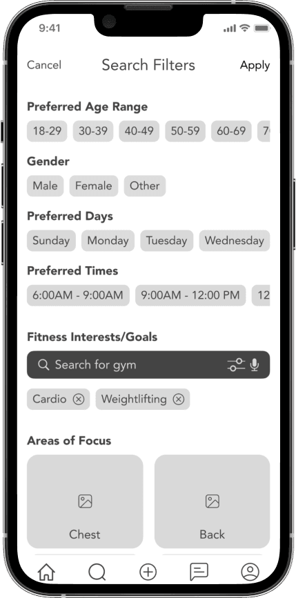 To address the user’s need for practical compatibility, I implemented a filter-first search logic that allows for discovery based on shared fitness goals and specific "Areas of Focus" rather than mere proximity.