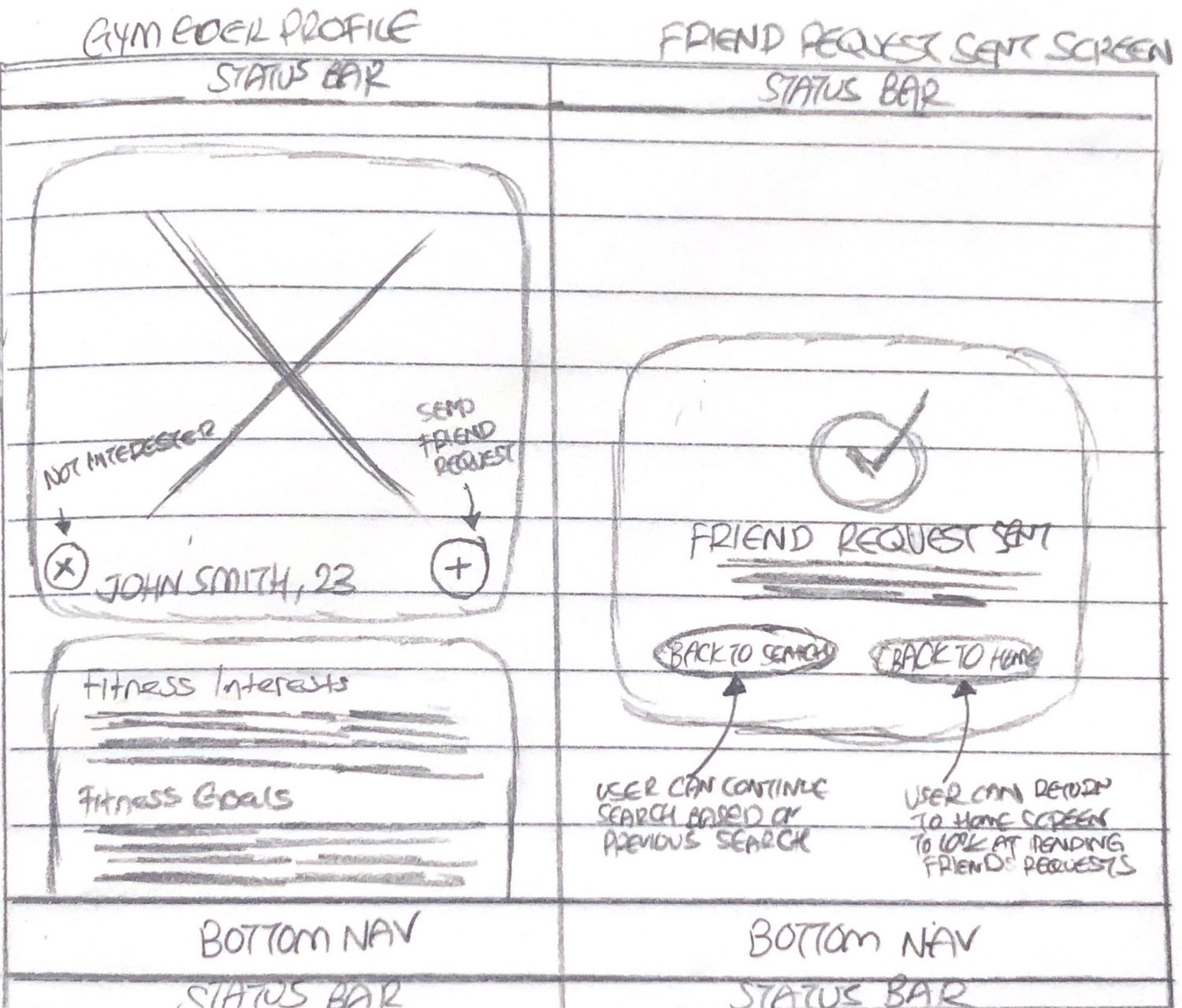 In the sketching phase, I prioritized low-fidelity validation to pressure-test the app's logical foundation before committing to high-fidelity design. By working on paper, I was able to rapidly explore multiple layout solutions, focusing purely on Information Architecture and navigational hierarchy. This allowed me to identify and eliminate potential friction points in the user journey early on, ensuring that the transition from a digital match to a physical meeting remained seamless and intuitive.